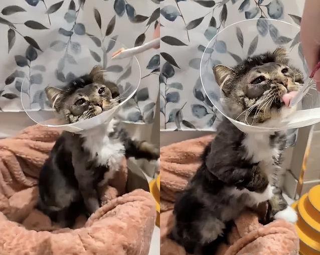 手术后,尤达得戴两周的头套,模样有点滑稽。可它一点没闹,乖乖让人喂饭,还享受被人多宠一点。寄养妈妈说:“这猫太甜了,受了这么多苦,还这么信任人。”